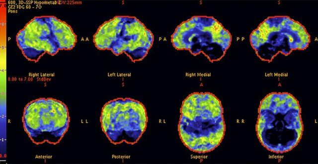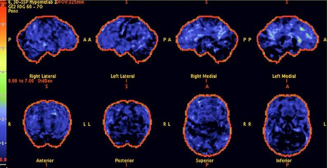 Above: The patient's PET scan after Mosswise treatment shows improvement, with cognitive abilities greatly enhanced as the scan approaches that of a normal brain.